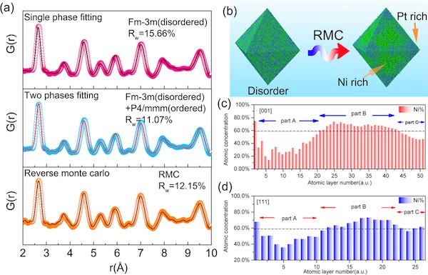 (a)在室温下,采用无序的FCC结构结合四方排列及RMC,Pt41Ni59合金NPs原子对的分布函数(PDF)的拟合结果。