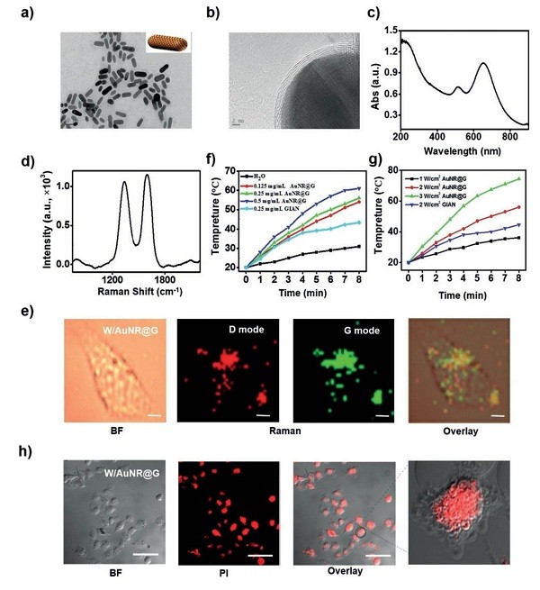 e)通过AuNR@G染色的Hela 细胞的拉曼成像照片(BF,明场)。