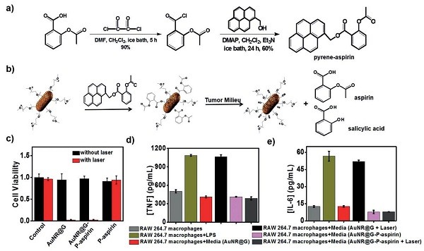 利用1-芘甲醇合成抗炎症前药 : 芘-阿司匹林(P-aspirin),前药上携带的可分裂酯键,有利于与金纳米棒封装的石墨纳米胶囊(AuNR@G)的结合。通过π-π键相互作用得到的光热治疗剂,AuNR@G-P-aspirin 复合物可用于近红外光激发下实体种瘤的光热消融治疗,与此同时,阿司匹林在肿瘤环境下的释放可以实现对PTT引发的炎症反应的抑制。在实现癌症治疗的同时,阿司匹林的释放抑制了PTT带来的炎症反应等一系列影响癌症治疗效果的副反应,为癌症治疗开辟了新思路。