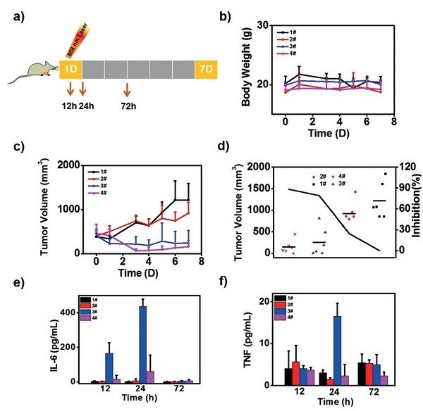 e-f) 不同处理组老鼠血清中细胞因子水平评价。(1#: d-PBS, 2#: d-PBS + laser, 3#: AuNR@G + laser, 4#: AuNR@G-P-aspirin + laser)