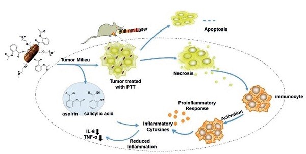 PTT治疗后肿瘤细胞的坏死是杀死肿瘤细胞的主要形式。激光照射后,在AuNR@G-P-aspirin 复合物作用下,aspirin的释放会使细胞炎症因子的表达降低(如:白细胞介素-6和肿瘤坏死因子-α表达降低),进而抑制炎症反应,抑制肿瘤的复发和再生。