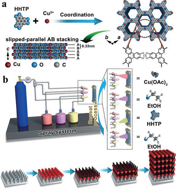 电子导电金属有机框架(Electronic Conductive Metal-Organic Frameworks,EC-MOFs)材料是一类新兴的由金属离子或金属离子簇和有机配体通过配位键自组装形成的导电多孔晶态材料,是新出现的一类集多孔性、选择性与半导体特性于一体的晶体材料。因其丰富可设计的晶体结构和可调节的电子能带结构等优势,使EC-MOFs材料作为活性功能组分在新型的场效应晶体管、锂电池、超级电容器、气敏传感器等半导体电学器件领域具有很高的研究价值和应用潜力。然而,已报道的EC-MOFs材料的应用大部分采用粉末或厚膜形式,巨大的颗粒尺寸和晶界限制了电学器件中的电子和物质传输。众所周知,薄膜的质量是高性能的器件的重要决定因素之一。层层自组装(layer-by-layer,LbL)液相外延的方法是一种有效制备厚度可控、同质均一MOFs薄膜的方法。然而,仅有部分具备特殊的次级结构(second building units,SBU)的MOFs能采用LbL法制备薄膜。将LbL法应用于EC-MOFs导电薄膜的可控外延生长迄今并无相关报道。