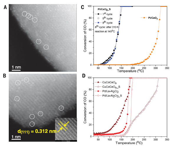 北京2017年12月15日,Science在线发表了华盛顿州立大学王勇教授、美国新墨西哥大学Abhaya K. Datye(共同通讯)团队题为“Activation of surface lattice oxygen in single-atom Pt/CeO2 for low-temperature CO oxidation”的文章,该研究证明了已经热稳定的二氧化铈(CeO2)上原子分散的离子铂(Pt2+)如何可以通过蒸汽处理(在750℃)进行活化,以实现低温一氧化碳(CO)氧化活性的目标,同时提供优异的水热稳定性。研究发现,在Pt2+附近的CeO2上形成新型的活性位点,改善了反应条件。在氧化环境中,这些活性位点在800°C以下稳定。蒸汽处理后,Pt2+催化剂可以在150℃下变得对CO氧化有活性。在模拟汽车尾气的研究中,这种催化剂处理还改善了其对诸如碳氢化合物等其它尾气成分的氧化活性。
