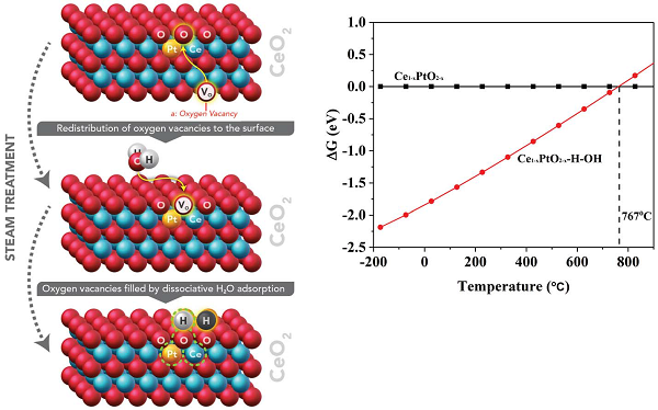 图3 原子分散的Pt/CeO2催化剂上的蒸汽处理效果