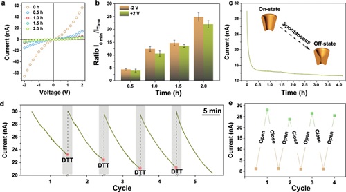 (b)纳米门控系统的电流比(开合比)随时间的变化;