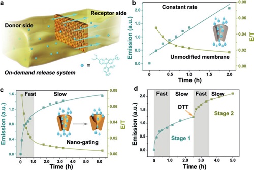 (d)纳米门系统的可控释放过程:DTT激活可以改变纳米门的状态,使运输速率由慢变快。