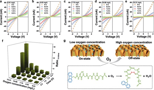 (f) 在不同氧浓度下纳米门控系统的电流比(开合比)随时间的变化;