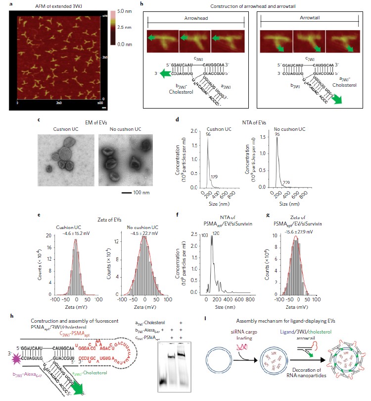 这项研究使用RNA纳米技术对原生细胞外囊泡进行有效的重新编程。使用RNA纳米颗粒的方向来控制细胞外囊泡上的siRNA和miRNA的负载或在细胞外囊泡的表面实现有效的细胞靶向性,以及控制siRNA和miRNA的递送,且对癌症退化产生作用。在三种动物模型中,经过重新编程的细胞外囊泡表现出强大的生理化学性质,癌细胞特异性靶向性增强,且能有效释放细胞内siRNA以抑制肿瘤生长。