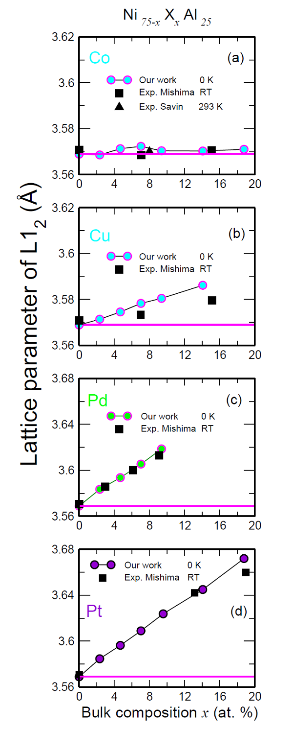 图1 Ni75-xXxAl25合金的晶格参数随三元素组成x(at.%)的变化与实验(RT和293 K)数据对比