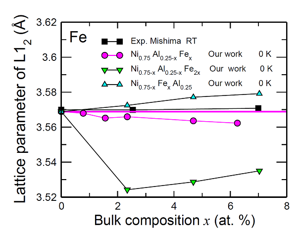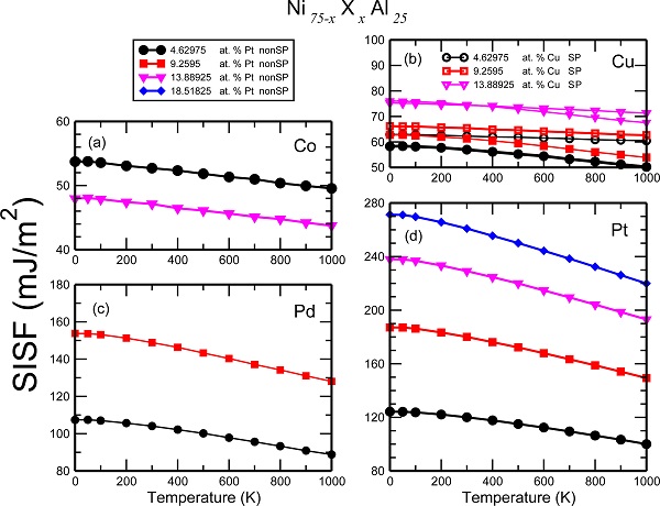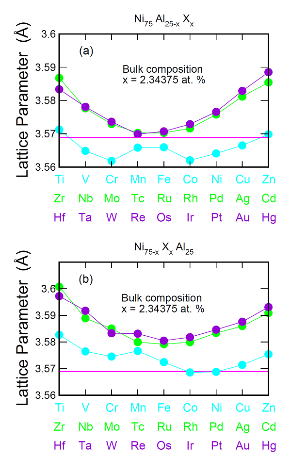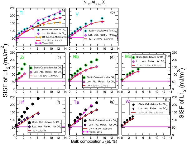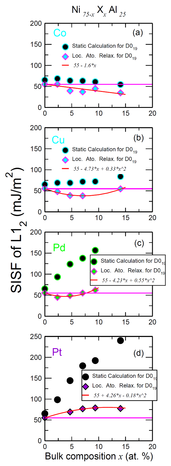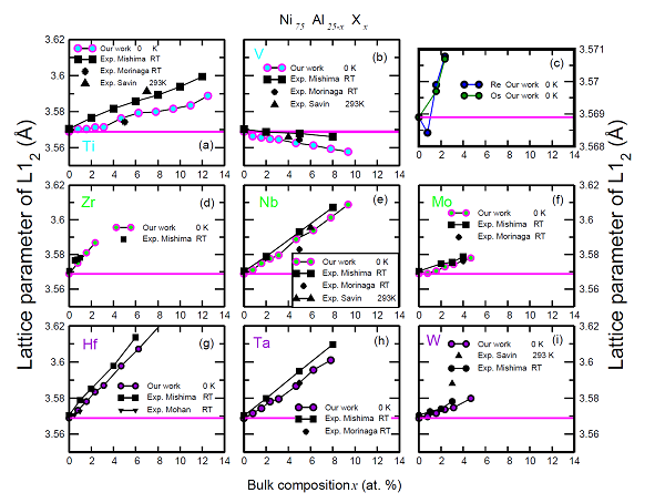 研究中,在重新计算后可以在Ni3Al基合金中建立以成分变化x为自变量,晶格参数和SISF能量变化为因变量的函数。除了Fe和Co之外,所有的三元加成都能让以组分x为自变量、晶格参数为因变量呈线性增加关系;除钒之外,晶格参数随成分增大而单调降低。取代Al的铁和所有三元素都会增加SISF能量,与引入合金元素会减少层错能的γ-Ni情况形成对比。这可增加γ’的析出、提高了抗剪切能力,最终可提高Ni高温合金的高温强度。仅Co会降低SISF能量,促进γ’相层错发生断裂,从而促进初生蠕变。