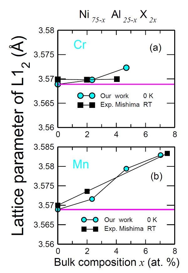 图2 Ni75Al25-xXx合金的平衡晶格参数随三元素组成x(at.%)的变化与实验数据(RT和293K )对比