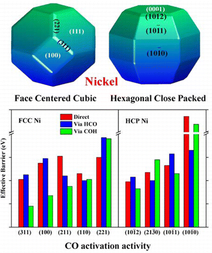金属镍是常用的一氧化碳(CO)甲烷化,甲烷水汽重整反应催化剂。常温常压下,金属镍体相具有面心立方(FCC Ni)晶格结构。当金属镍纳米粒子尺寸减小时,FCC Ni会相变为具有六角密堆晶格结构的HCP Ni。同时,实验上已经能够通过添加特定保护剂方法来定向合成HCP Ni纳米粒子。一般认为CO活化是甲烷化过程的速控步骤,探索CO解离活性对于金属Ni晶相和形貌的依赖关系,对优化设计高活性甲烷化Ni基催化剂具有重要的意义。我们利用密度泛函理论计算方法系统研究了CO解离对金属Ni晶相依赖关系,从微观上理解了FCC和HCP Ni上CO直接活化和氢助活化(CO+H → HCO → CH+O或者CO+H → COH → C+OH)过程,确立了活性中心结构和CO活化机理。理论研究表明,FCC和HCP Ni具有不同的晶体结构对称性决定了它们具有不同的形貌和暴露表面结构。在FCC和HCP Ni上,CO吸附结构不敏感,而CO活化过程具有显著的结构敏感性,CO氢助解离比直接解离更容易。在FCC和HCP Ni高活性表面上,CO经由COH中间体的氢助解离过程更加有利。而在FCC和HCP Ni活性较低的表面上,CO需经由HCO中间体氢助解离。理论计算表明FCC Ni比HCP Ni具有更高的CO解离活性和活性位密度。而在金属钴上,HCP Co比FCC Co具有更高的CO解离活性。同时在HCP Co上,CO直接活化比较有利,而在FCC Co上,CO需要氢助活化。金属Co和Ni具有不同的晶体结构敏感性和CO活化机理,这主要因为反应中间体的吸附强度不同导致。这为理解和设计高活性金属基合成气转化催化剂提供更多的理论指导。(J. Phys. Chem. C, 2016, 120 (43), 24895–24903)