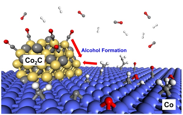 长期以来合成气选择性转化到含氧化物,用的都是价格昂贵的贵金属,而碳化钴长期以来被认为是费托反应的非活性相。刘进勋博士和李微雪教授通过理论计算,发现碳化钴具有很好金属性,可很好地吸附CO,但却不能解离CO,金属钴具有很好地解离一氧化碳的能力。因此由金属钴和碳化钴形成的界面,可以有效地形成含氧化物,相应的计算也证实了这一点。计算结果很好地解释了相应的实验研究结果。研究结果表明,可以利用非贵金属及其碳化物形成的稳定的界面,来实现催化反应选择性的有效调控,替代贵金属,文章发表在ACS Catal., 2015, 5, 3620-3624.。