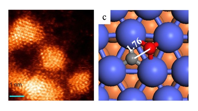 煤、生物质、页岩气来源的合成气,经费托合成制液体燃料是缓解目前石油资源短缺、满足能源需求急剧增加的重要途径。钴基催化剂因其较高的长链烷烃选择性和活性、稳定性,长期以来受到关注。费托合成反应是一个低温有利的强放热反应,寻找低温、高活性的钴基催化剂是目前研究的关键。 北京大学马丁团队发展了一步加氢-还原方法,在Co催化剂中加入摩尔比为5%-10%的贵金属Pt,成功地合成了Pt-Co双金属纳米催化剂,在413-433K温度下实现了高效液相费托合成:CO转化率达到1 mol COmol Co-1 · h-1, C2-5和C5+选择性达到17%和70%。而在对照实验中,分步还原的Pt-Co双金属催化剂及纯Co纳米催化剂在相同温度下CO转化率仅为0.10 mol COmol Co-1 · h-1及0.09 mol COmol Co-1 · h-1。原子分辨球差矫正扫描透射电镜表明, Pt-Co双金属催化剂存在多种结构分布;而控制合成实验排除了Co纳米粒子负载的单原子Pt作为催化活性中心的可能。 刘进勋博士和李微雪教授在基于原子分辨的球差矫正扫描透射电镜和同步辐射X-射线吸收精细结构光谱表征基础上,以CO分子的活化为探针反应,展开了大量的理论计算研究。从理论上排除了实验上所观察到的大量不同结构的可能贡献,最终确定铂-钴双金属催化剂的活性中心为外延生长在Pt纳米粒子表面上的2-3原子层厚的金属钴薄膜。其高活性来源于铂-钴界面晶格失配导致钴薄膜处于拉伸状态,改变了CO断键过渡态的结构,降低了反应活化能,从而显著提升了反应活性。李微雪研究团队最近几年集中力量在合成气选择性转化的理论研究上。研究中所采取的“材料可控合成→催化反应→高分辨电镜、原位表征→理论计算反应机理”策略,也是目前多相催化研究的趋势和发展方向。(J. Am. Chem. Soc., 2013, 135 (10), 4149–4158)
