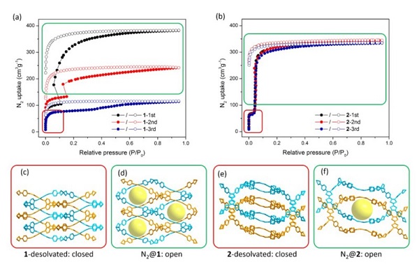 化合物1和化合物2的气体吸附结果,及其在不同状态下的结构图