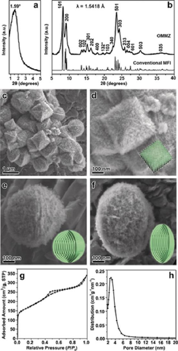 沸石是一种重要的催化剂,常用于石化产品以及精细化学品的生产。但是,单一的小孔径分布(0.4–1.2 nm)限制了它的应用范围,尤其是大分子的运输。而有序介孔结构有利于实现高效的物质输送,也利于提高大分子的形状选择性,进而可以拓宽沸石结构的应用领域。过去的十年时间,研究人员已经制备了多种分级的多孔沸石。但是,高度有序介孔沸石的成功制备仍然很少,原因可能是模板分子与沸石框架结构之间的协作有效的自主组织无法很好地实现。目前,已有几篇关于1D介孔片状沸石的研究报道,但是当表面活性剂移除后,沸石结构就会坍塌,而关于2D或者3D有序介孔沸石,目前仅有一篇关于2D六方介孔沸石的报道。