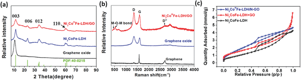 a)Ni2CoIIIFe-LDH/N-GO, Ni2CoFe-LDH及GO的XRD谱图