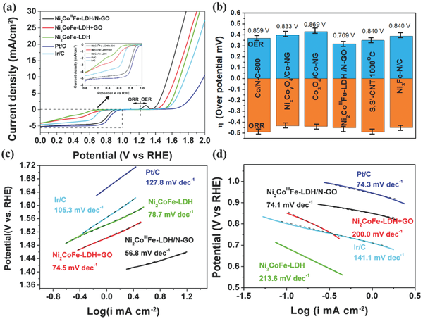 b)本工作中的Ni2CoIIIFe-LDH/N-GO与之前报道的材料在ORR、OER催化性能及ORR和OER间过电压方面的比较
