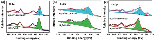 Ni2CoIIIFe-LDH/N-GO and Ni2CoFe-LDH材料中a)Ni, b)Fe, c)Co元素分析