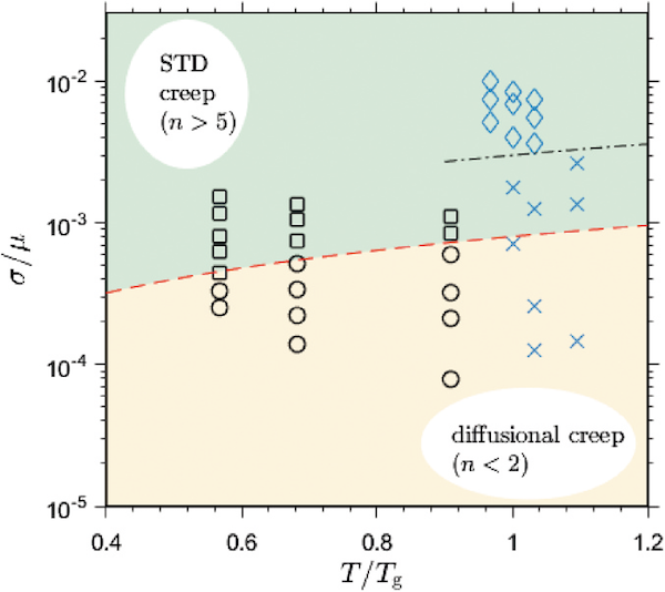 μ代表材料的弹性模量。 模拟数据被表示为圆圈(n <2)和正方形(n> 5)。 红色的虚线表示将主要剪切变形(STD)机制与原子扩散机理区域分开的边界。 还显示了具有菱形(n> 5)和十字(n〜1)的实验数据(9)。