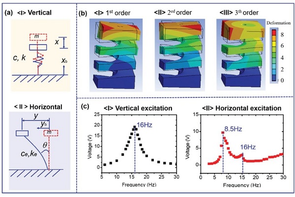 螺旋的、柔性的摩擦纳米发动机能够在水平和垂直方向上振动。它的共振频率和有限元模拟具有一致性。它的性能能够通过选择合适的材料、改性表面形貌,进而,增加其充电的电流密度。因此,摩擦纳米发动机能够收集任意方向能量,如:海水波、海风振动和走路振动等,也能够作为自振式传感器。