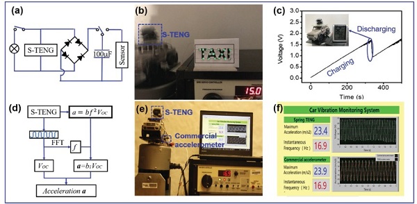 图5 螺旋摩擦纳米发电机的振动能量收集和振动传感器应用