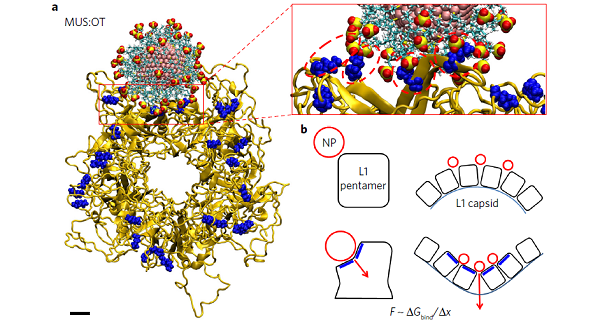 近日,洛桑联邦理工学院Francesco Stellacci(通讯作者)团队设计了模仿HSPG的抗病毒纳米颗粒,病毒与VAL重复单元的结合最终产生使病毒不可逆变形的力(〜190pN)。病毒检测,电子显微镜图像和分子动力学模拟都证明了所提出的机制。这些颗粒不具有细胞毒性,并且体外纳摩尔不可逆活性可以对抗单纯疱疹病毒(HSV),人乳头瘤病毒,呼吸道合胞病毒(RSV),登革热和慢病毒。相关成果以题为“Broad-spectrum non-toxic antiviral nanoparticles with a virucidal inhibition mechanism”发表在了Nature Materials上。