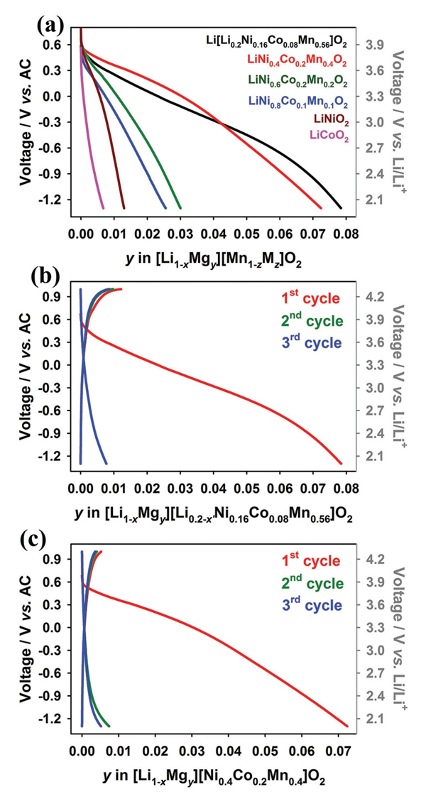 (b) LiNi0.4Co0.2Mn0.4O2 (i) 未处理 (ii) 脱锂 (iii) Mg2+插层的材料。