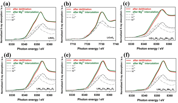 (a) Li[Li0.2Ni0.16Co0.08Mn0.56]O2、LiNi0.4Co0.2Mn0.4O2、LiNi0.6Co0.2Mn0.2O2、LiNi0.8Co0.1Mn0.1O2、LiNiO2和LiCoO2镁电池材料的脱锂过程;
