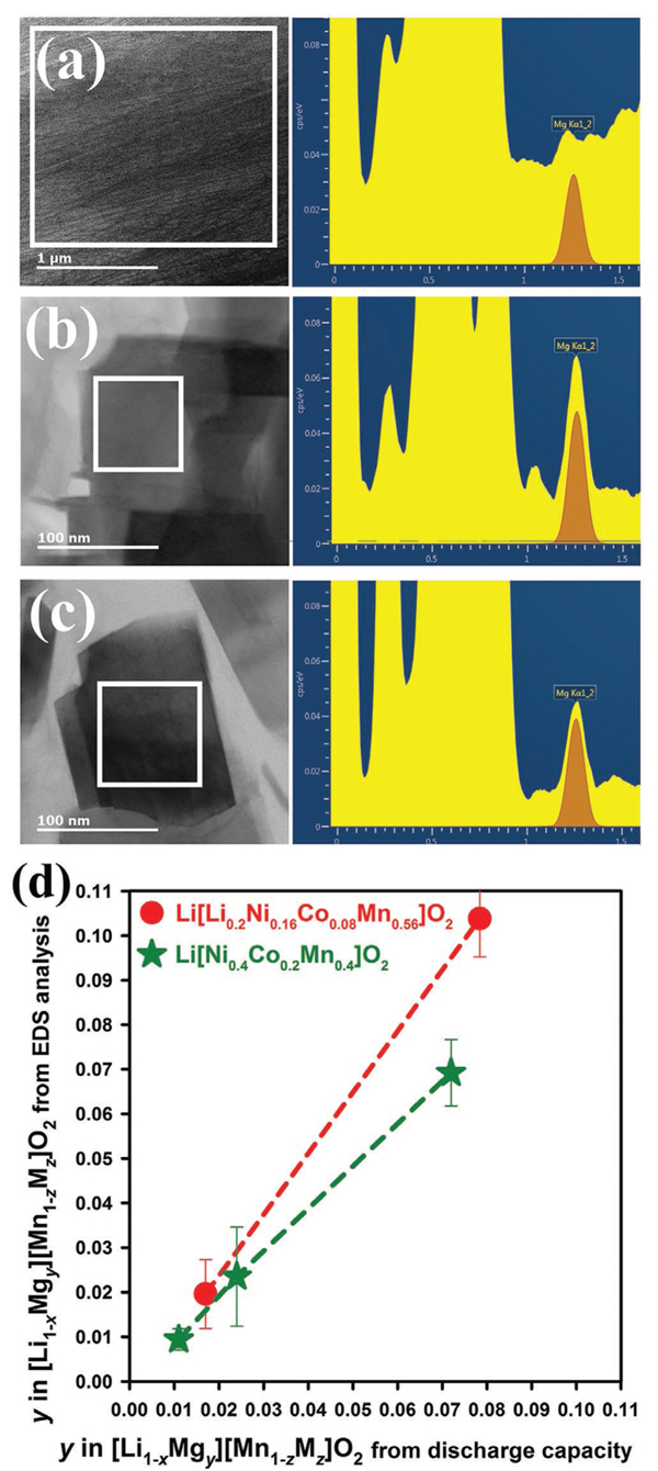 (b) Li[Li0.2Ni0.16Co0.08Mn0.56]O2的原位Mg2+掺杂,循环3圈后的截面TEM和EDS图。