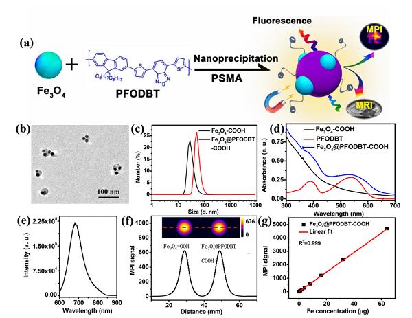(a) 纳米沉淀法制备两性纳米粒子Fe3O4@PFODBT-COOH示意图