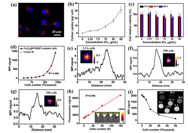 (f-g) 标记后细胞的MPI线性扫描光谱(f)500个细胞(g)250个细胞
