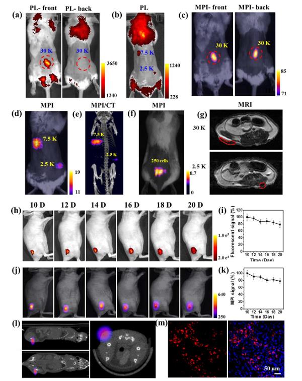 (l) 植入20天后整个老鼠的MPI成像的三维投影和CT成像