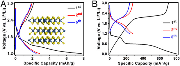 以上两种测试条件下,层状的MoS2均表现出小的有用容量;