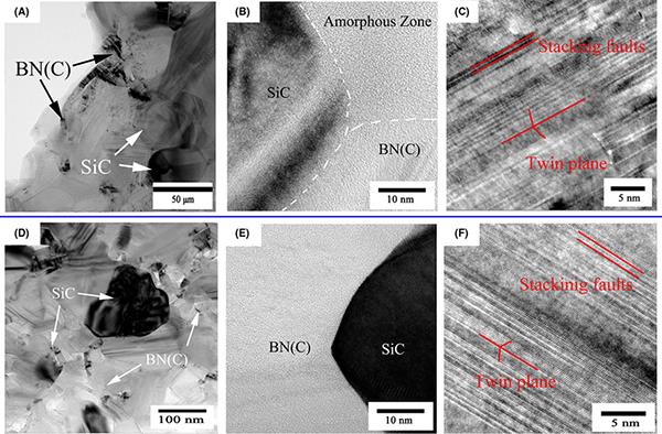 碳贫SiBCN大块材料由大量的Si金属,t-BN和少量的SiC组成,而中度碳含量和富碳整体材料则是以碳化硅和乱层氮化硼为主。Si3N4和B4C的原位形成在热力学上是不可行的。烧结过程中SiC反应优先级高于BN(C),同时该研究成果表明随机嵌入无序碳可以有效地提高BN(0002)基面的缺陷团聚,从而决定BN(C)相的形貌。通过机械合金化及反应热压后,SiBCN整体材料显示出碳含量依赖性相组成且微观结构伴有形态演变,过高或过低的碳含量都会使其机械性能恶化,该研究成果将对选择具有优质机械性能的SiBCN整体材料提供理论参考。