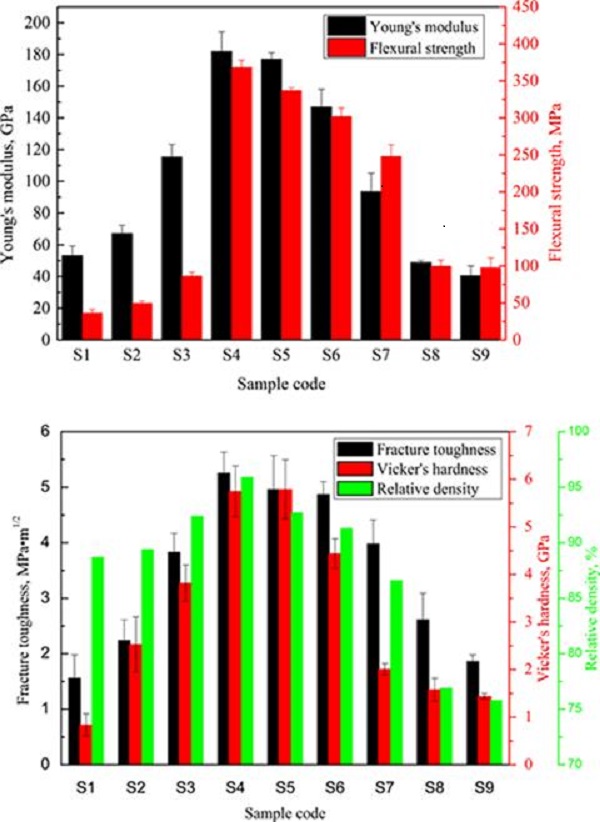 图4 不同碳含量SiBCN大块材料力学性能和相对密度对比