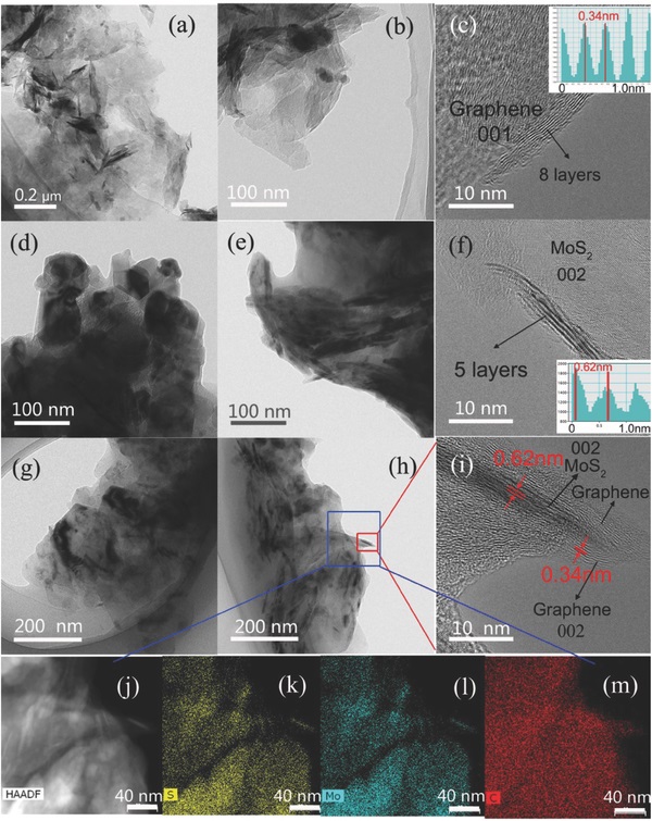 (j) (k) (l) (m) MoS2/G的STEM-EDS图像。