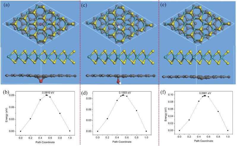图-8. 带有不同官能团的单层MoS2和石墨烯的原子排列方式及其中钠离子的扩散方式
