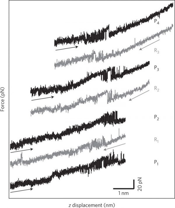本研究结果显示,供体 – 受体寡聚四氢化物,哑铃结构由被1,5-二氧代萘单元间隔的寡聚醚链组成,一半被环双(百草枯 – 对 – 亚苯基)环包围,能够在重折叠中施加显着的力抵抗高外部负荷。即使在高负载率下也观察到波动。这意味着这些分子的热动力学非常高,使得它们是在超高的加载速率下还能测得快速的折叠速度。机械互锁结构最有可能是造成这种非常强劲和高度动态折叠的原因。该研究从大自然的分子机器中获得灵感,这种分子机制利用了定义明确、稳定而高度动态的系统。该篇报道的新兴合成的寡聚半胱氨酸类化合物具有有效性、稳定性和错综复杂的动力学调节性能。种种研究结果表明,该物质有望超过天然折叠蛋白的性能。