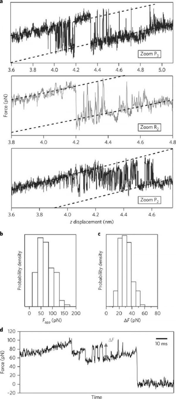 d)力 – 时间曲线(加载速率:104 pN·s-1(350 nm·s-1))。ΔF是由分子重新获得其局部折叠状态所施加的力。