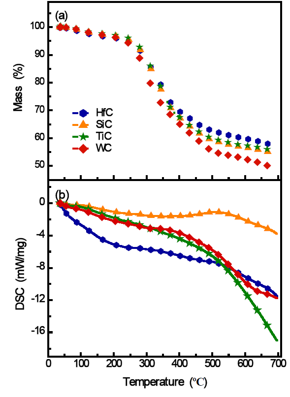 图2 碳化物的显微结构: HfC (a), SiC (b), TiC (c),和WC (d)