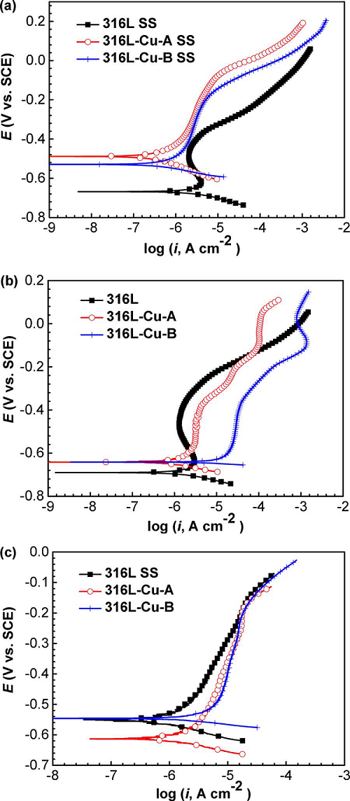 在图中可以看到,几乎所有钢都会被钝化。在316L-Cu-A的icorr最小时,对于316L SS,存在最大的腐蚀电流和最窄的阴极可以消减范围。阴极电流密度暗示着钢作为阴性电极的稳定性。阴极为316L-Cu-A的电化学稳定性比316L-Cu-B的要高。