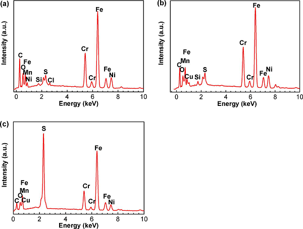 图中Fe, Cr, Ni 和 C元素可以在每个图中找到。Fe, Cr 和Ni是在不锈钢表面阴极薄膜主要的组成物。S元素是316L SS和316L-Cu-A中属于微量元素。