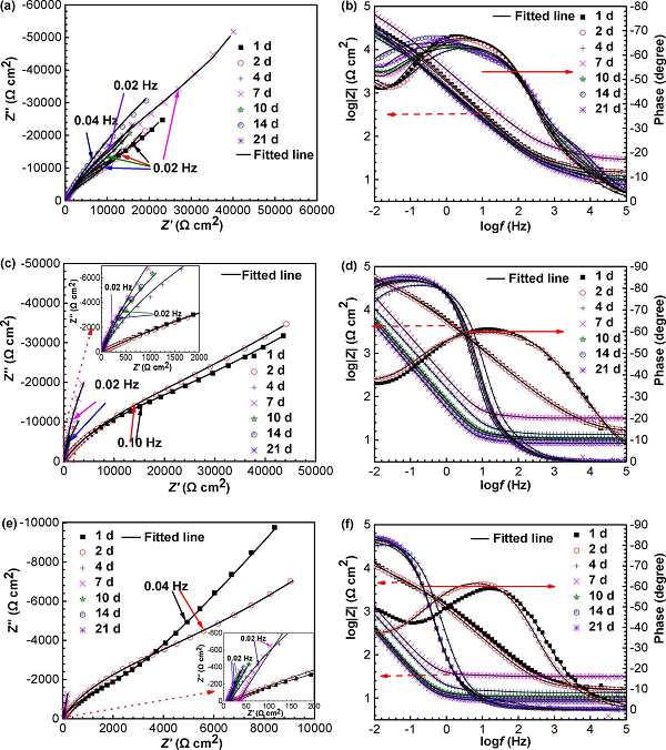(a)和(b)主要是316L SS,(c)和(d)是316L-Cu-A, (e )和(f) 为316L-Cu-B。在适当电流回路下,黑色的固相线满足阻抗曲线。