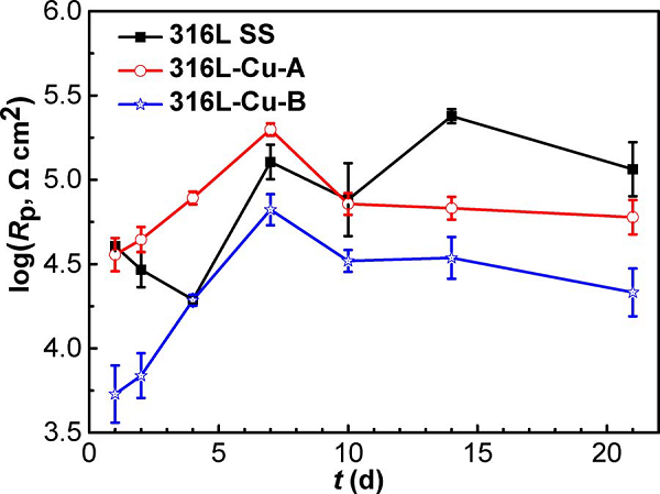 图7. 在SRB培养基中对于三种类型的316L SS电极Rp 值的时间依赖性。误差线代表三种实验的标准偏差