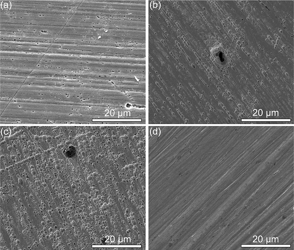 图8. 显示了在SRB介质中放置 21天后除去生物薄膜和腐蚀产物的OCP试样表面形态SEM图像
