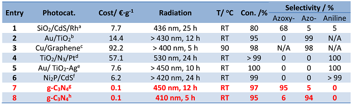 文献链接:Light-tuned selective photosynthesis of azo- and azoxy-aromatics using graphitic C3N4(Nat. Commun. 2018, doi:10.1038/s41467-017-02527-8)