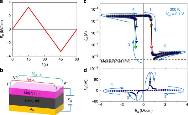 c.通道电流Isd的重复和可再现的切换作为栅极电场EG的函数,在300K下由Vsd = 0.1V的测量