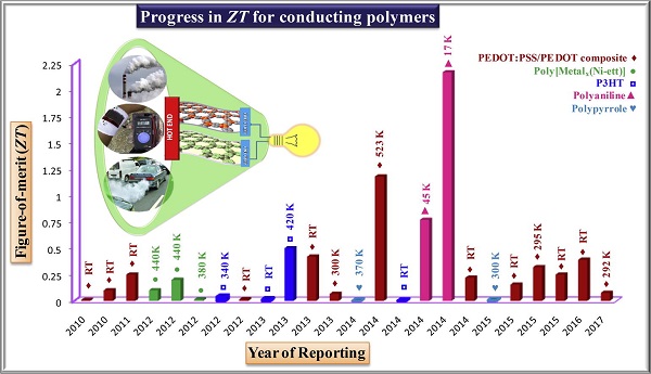 尽管在过去的十年中,导电聚合物已经应用于包括电子,超级电容器,传感器,晶体管和存储器等各种柔性器件中,但对其在热电发电领域的探索还不是很大。近日,巴巴原子研究中心Meetu Bharti、Ajay Singh(共同通讯)等人提供了关于各种导电聚合物的热电性能的综合研究。指出最近有机热电材料的发展方向:(1)影响热电性能的因素; (2)改善功率因数所需的策略(由于固有的低导热率); (3)仍然面临的挑战。电和热传输机制的详细分析表明,可以应用诸如拉伸,受控掺杂和添加无机材料/碳纳米结构的各种工艺来提高热电品质因数。