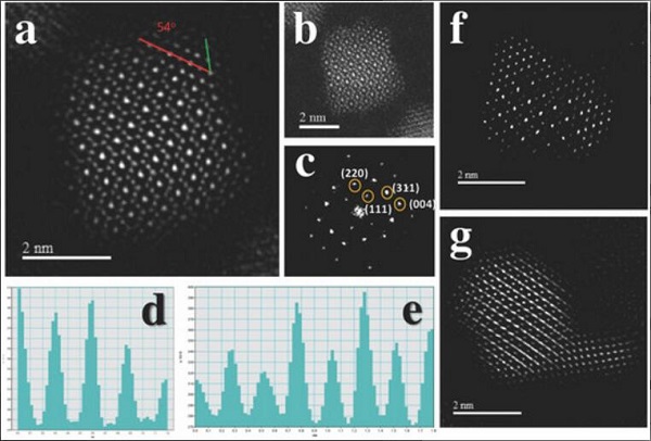 f,g) 其他IFFT处理的HAADF-STEM图;